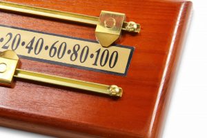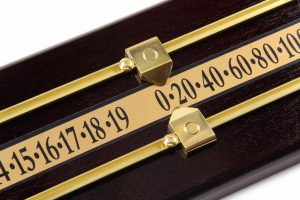 Top quality wooden scoreboard with a mahogany finish and brass sliders and point markers for up to 4 players