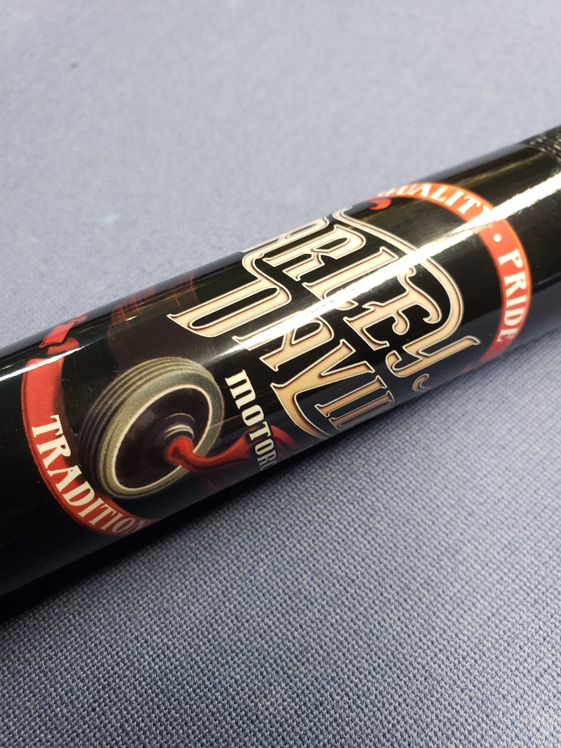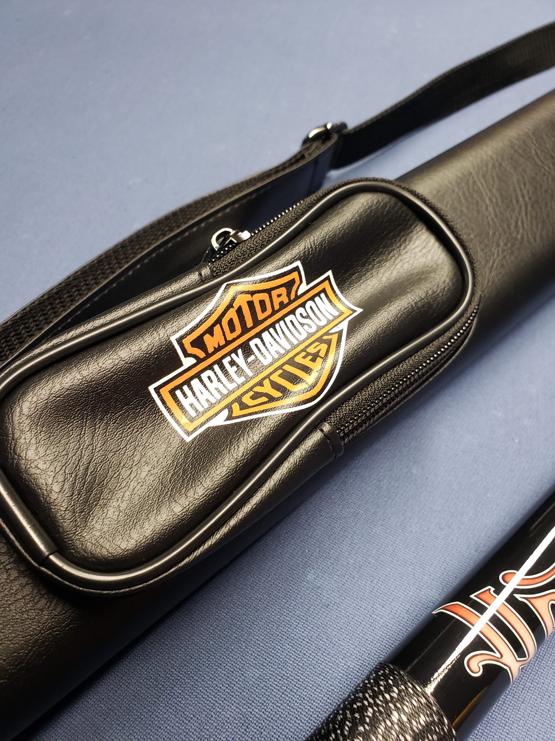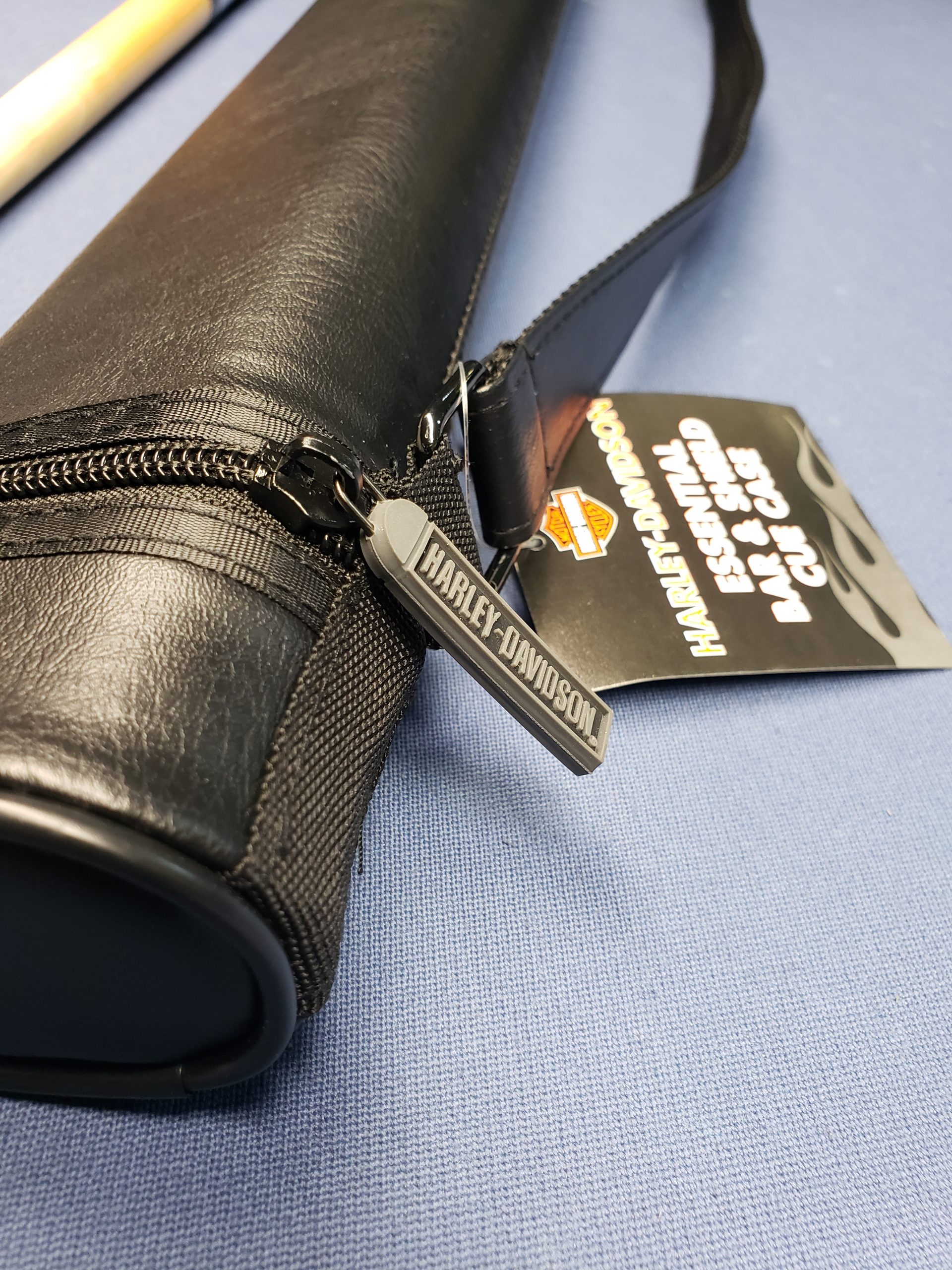 Hard Harley Davidson tube cue case with accessory pocket, strong carry strap and studded base