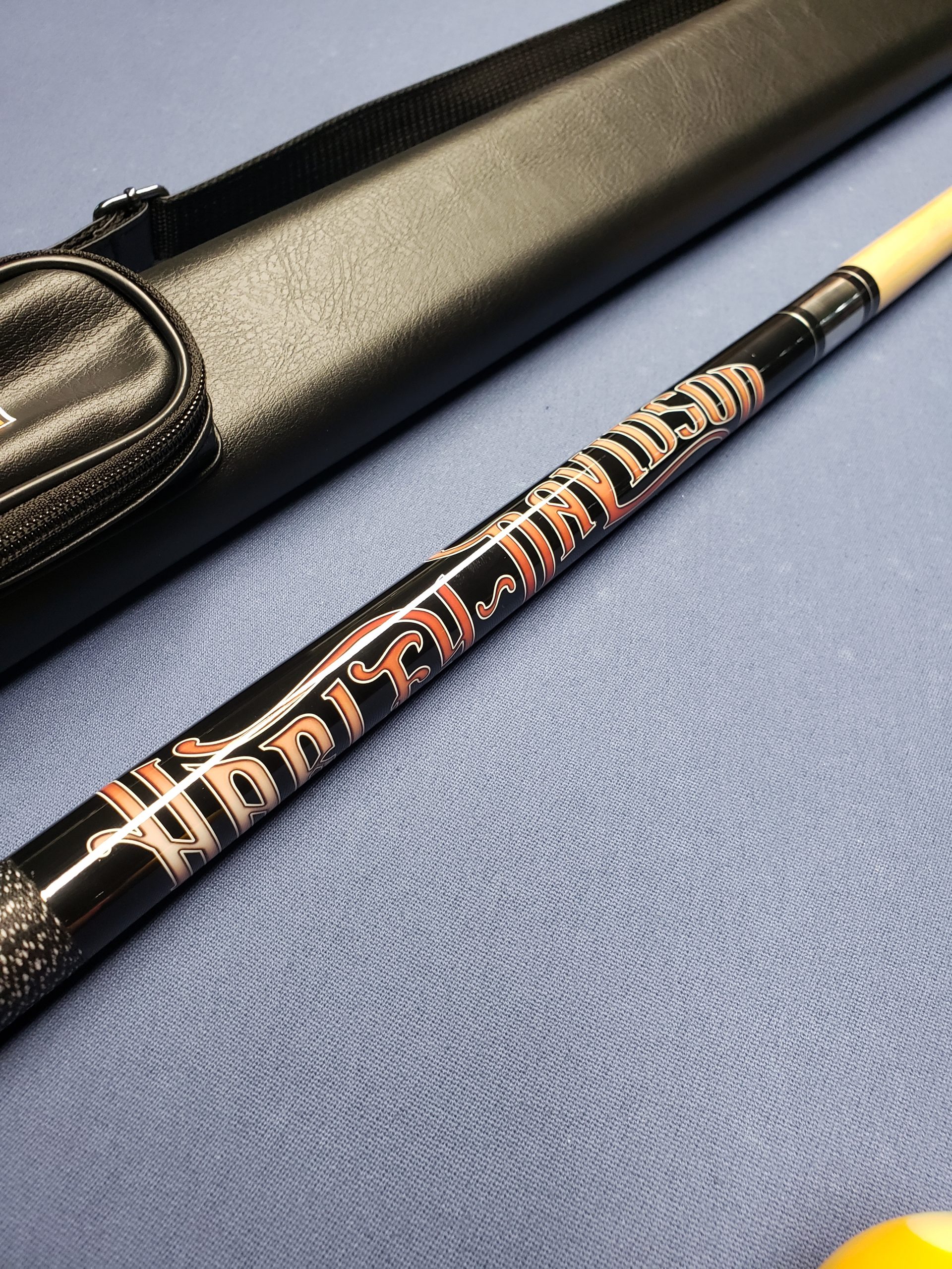 Harley Davidson Pro Traditional 2 piece centre jointed cue set with hard tube case, chalks and towel